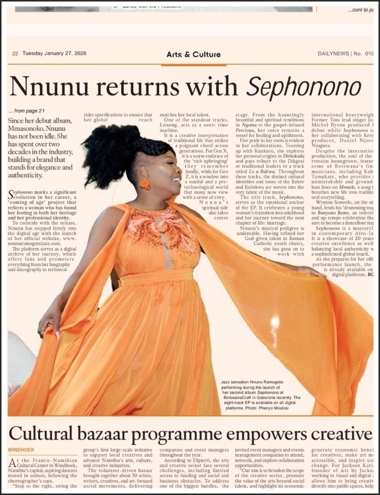 I am deeply grateful to the Arts & Culture team and everyone at Daily News who took the time to listen, ask thoughtful questions, and frame this article with such care. You captured what Sephonono means to me: a coming‑of‑age project—grounded in the soil that raised me, shaped by our rhythms and languages, and offered with reverence.