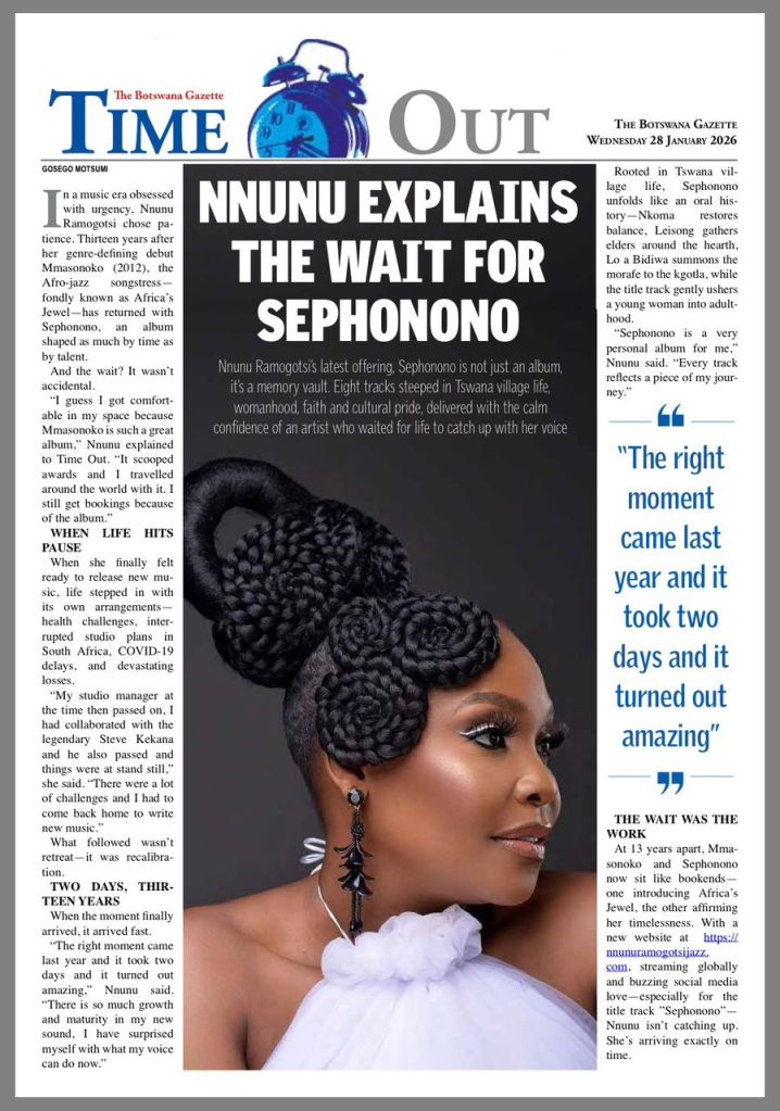 Today my heart is full. Time Out, the arts & culture section of The Botswana Gazette, shared a generous feature on my new album Sephonono—a piece of work that grew slowly and deliberately, in step with life, memory, and faith.