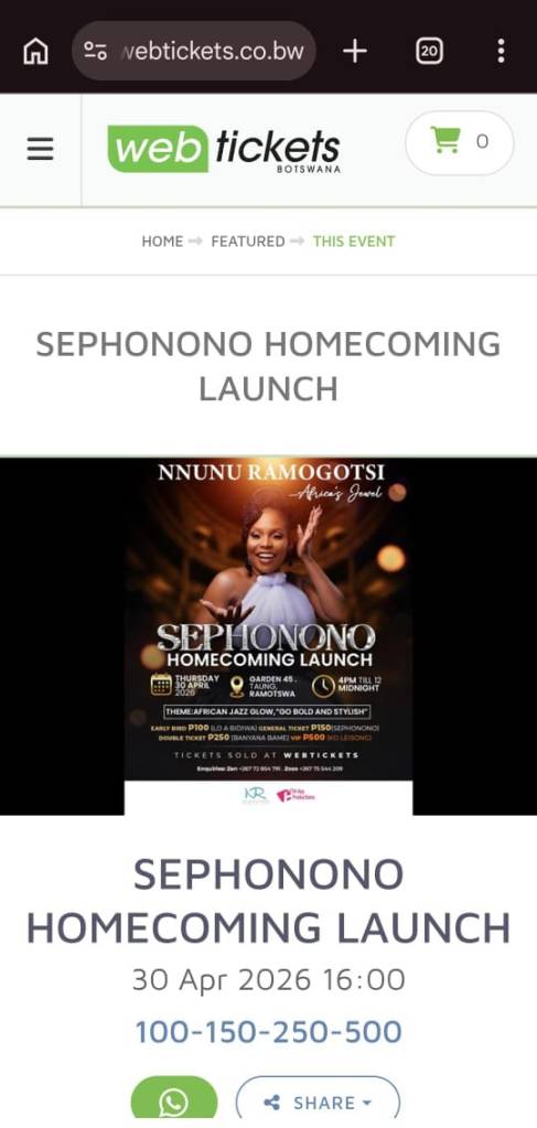 There are moments in an artist’s journey that feel less like events and more like destiny unfolding in real time. Moments when the universe seems to whisper, “You are exactly where you were always meant to be.” Today is one of those moments.Because Sephonono — the album that has stirred hearts across Botswana and beyond — is finally coming home. And not with quiet footsteps, but with all the radiance, pride and celebration it deserves.Seeing the Sephonono Homecoming Launch officially live on Webtickets Botswana felt like holding a dream in our hands. A dream that has matured beautifully. A dream that is now stepping confidently into its own spotlight.This is not just another performance. It is a homecoming— a return to the soil that shaped the voice, the rhythm and the soul behind this music. It is Ramotswa… It is the warmth of community… It is jazz glowing under the night sky, wrapped in African elegance.The theme captures it perfectly: African Jazz Glow — Go Bold and Stylish. Because Sephonono was never meant to be small. It carries a boldness, a power, and a timeless grace that now returns to embrace the very people who gave it life.On 30 April 2026, Garden 45 will open its gates, welcoming music lovers, families, friends, and supporters from near and far. From 4PM until midnight, the air will be filled with celebration — not just of music, but of heritage, belonging, and artistic triumph.There is something deeply emotional about bringing music back home. It reminds us that no matter how far talent travels, the truest applause comes from the village, from familiar dust roads, from the people who knew the melody long before the world heard it.Seeing the ticket categories — from P100 to P500 — makes this homecoming warm and inclusive. Everyone is invited. Everyone has a place. Everyone is part of the journey.There will be glow. There will be style. There will be jazz that lingers in the air long after the final note fades. But above all, there will be Sephonono, proudly rooted in the village where its heartbeat began.This milestone is not just for the artist — it belongs to everyone who streamed the music, shared it, believed in it, and carried it into the world. Ramotswa, get ready. Botswana, a jewel is coming home. And it is coming home wrapped in gratitude, light, joy, and pure African brilliance.—If you’d like, I can turn this into a press release, a social media rollout, or a website feature.